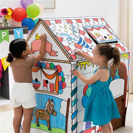 Az XL méretű játszóház ösztönzi a célirányos szerepjátékot, a nyelvi fejlődést és a mesemondást, miközben a gyerekek kifestik, díszítik és személyre szabják a saját terüket.