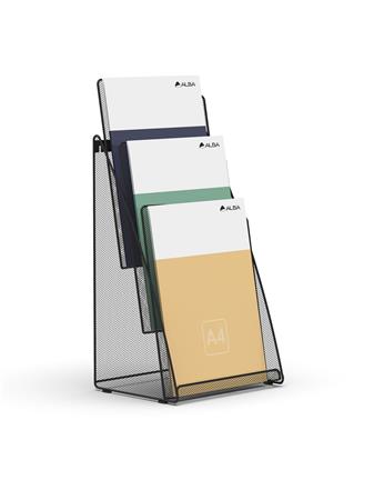 Prospektustartó, fémhálós, asztali, álló, A4, 3 rekesz, ALBA, fekete