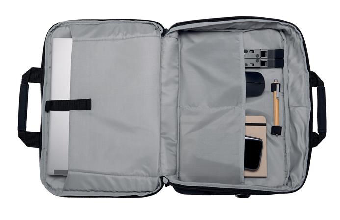 Ez a táska 52%-ban fogyasztás után újrahasznosított (PCR) poliészterből készül 23 x 250 ml-es műanyag palack újrahasznosításával. Modern és utazóbarát hordtáska, mely párnázott rekesszel rendelkezik és akár 16”-os laptopok (beleértve a 15,6”-os notebookokat is) hordozására is alkalmas. A cipzáras elülső rekesz és a több zseb könnyű hozzáférést biztosít a mappákhoz és a tartozékokhoz.