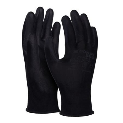 Jó minőségű, fekete poliészter kötött anyagból készült kesztyű, a markolat részén fekete poliuretán bevonattal.